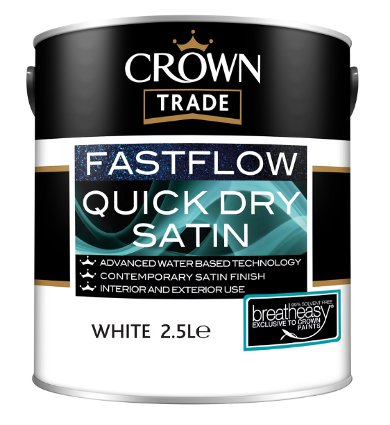 Excellent opacity, with a smooth attractive finish – Crown Trade Fastflow Quick Dry Satin is a pro choice when it comes to painting suitably prepared interior and exterior joinery and metalwork.
