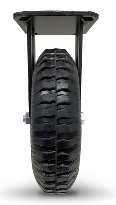Black baked enamel finished fabricated steel componentry with steel core centred, solid rubber outer wheel with double ball bearings.