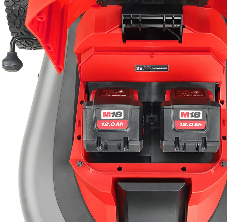 The lawn mower requires 2x 18V REDLITHIUM™-ION Batteries for operation. When paired with 2x 18V REDLITHIUM™-ION HIGH OUTPUT™ 8.0Ah Batteries (sold separately), the lawn mower delivers up to 50 minutes of runtime, allowing up to 1,600 m2 of cutting while removing 25 mm of grass at a 4.8 km/h self-propelled pace. With an infinitely variable self-propel speed dial, the lawn mower offers speeds between 0 – 6.4 km/h, and the Active Speed Management Paddle allows user to easily adjust their walking pace in operation while maintaining complete control of the lawn mower. The 18V FUEL™ 18″ (457 mm) Self-Propelled Dual Battery Lawn Mower features a steel deck, 3-in-1 grass management, single point height adjustment, a front LED light, vertical storage, two deck handles, and high lift mode, which allows the mower to tackle the most demanding applications. Equipped with a 18″ (457 mm) Mower Blade (49162786), the mower provides a true 18″ (457 mm) cut capacity, reducing missed blades of grass and clumping.