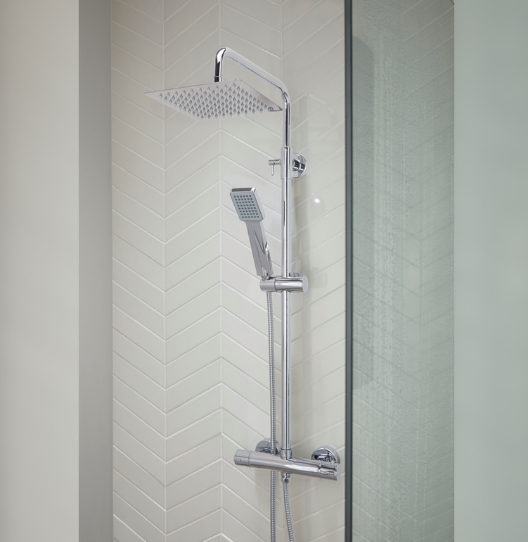The main showerhead has a wide square panel and is extra thin so less water goes for longer, saving energy. You can adjust its height using the dial at the side of the pipe to bring it closer to your head. Its thermostatic bar keeps the temperature of the shower steady, even if hot water diverts to a tap in another room. The precise temperature gauge stops your boiler from generating excess heat, saving you money on heating costs. The chrome finish keeps the shower looking new and resistant to corrosion.